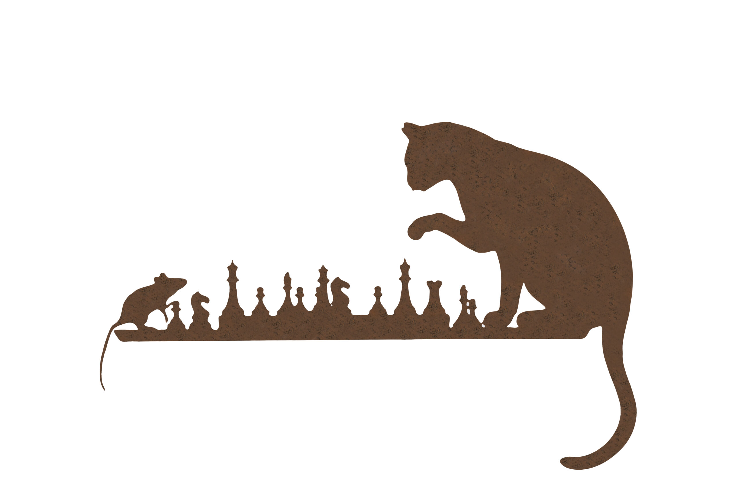 A stunning metal piece depicting a game of chess between a cat and a mouse. 40cm x 27cm