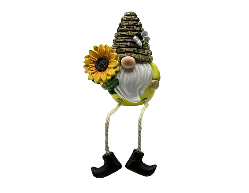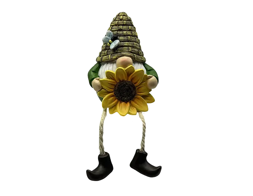 Each ornament measures approx H17 x W8 x D6cm, and are made of durable resin painted with bright colours, and features dangly string legs and is holding a sunflower. Perfect for sitting on windowsills and walls.
