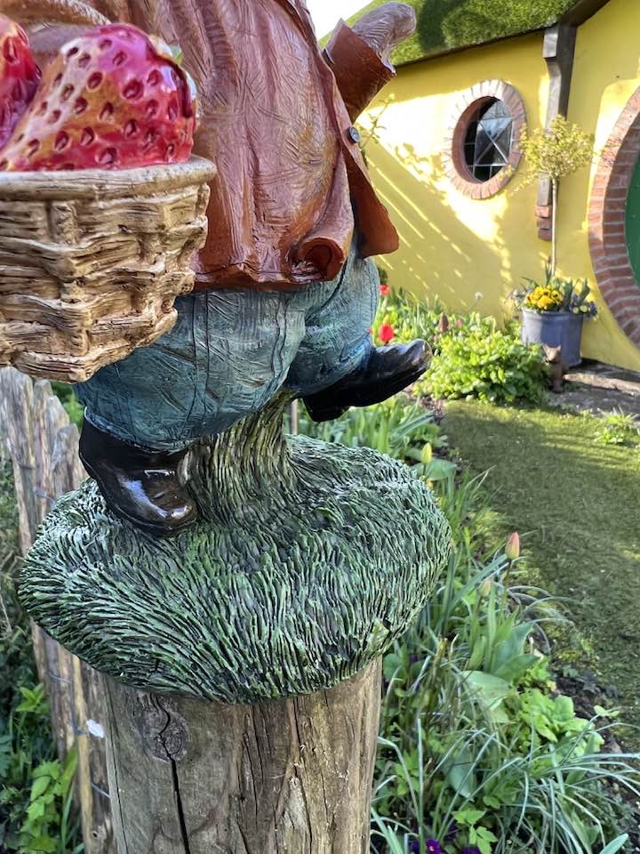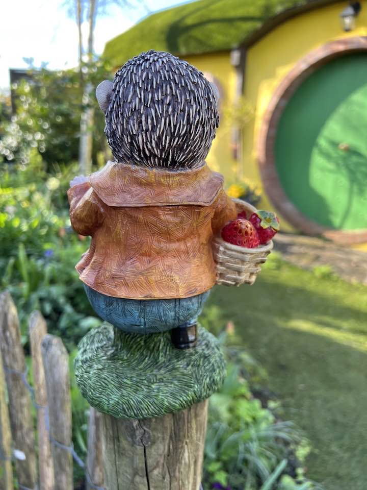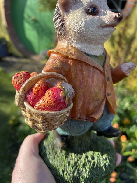 A beautifully detailed jaunty garden hedgehog carrying a basket of strawberries