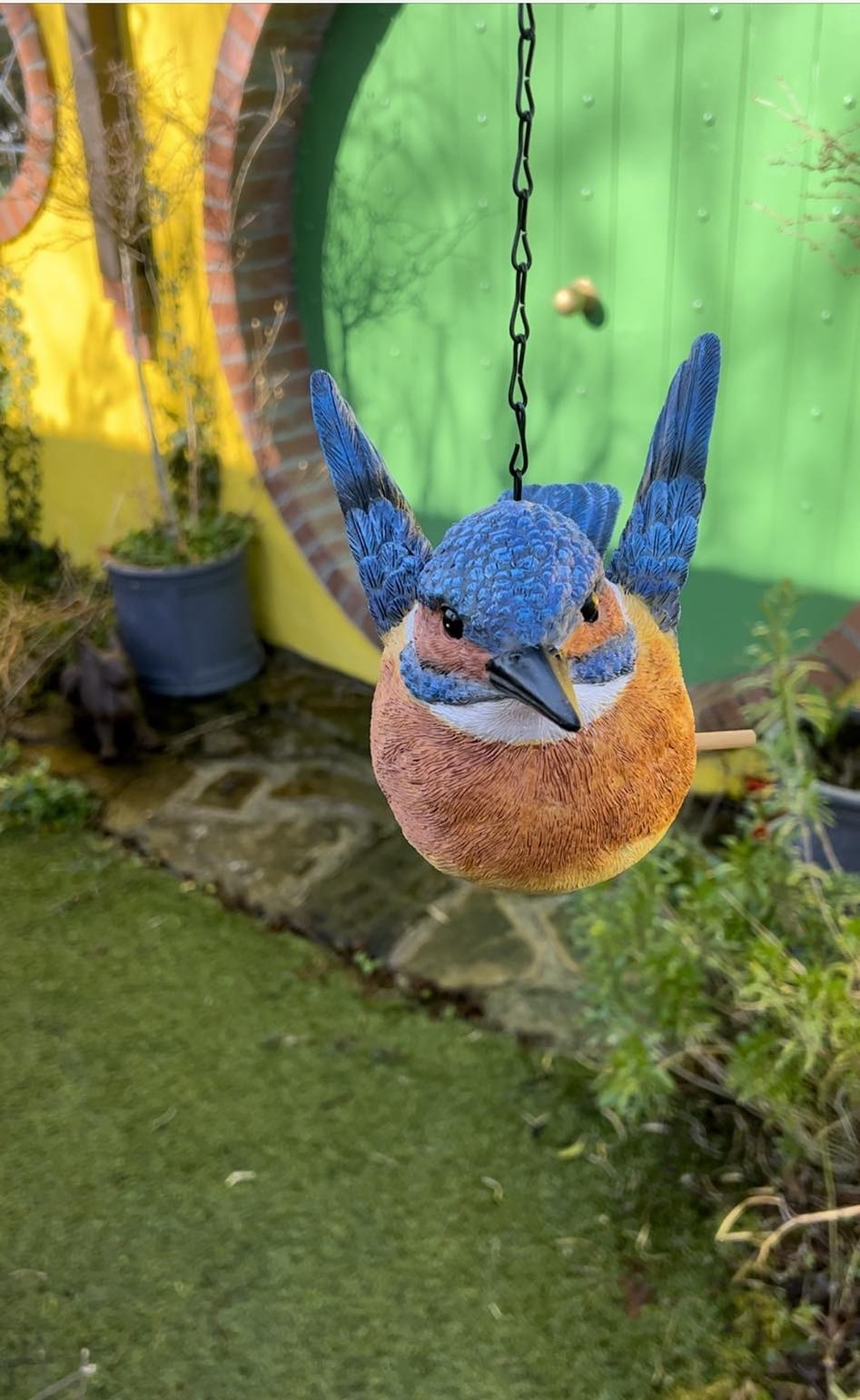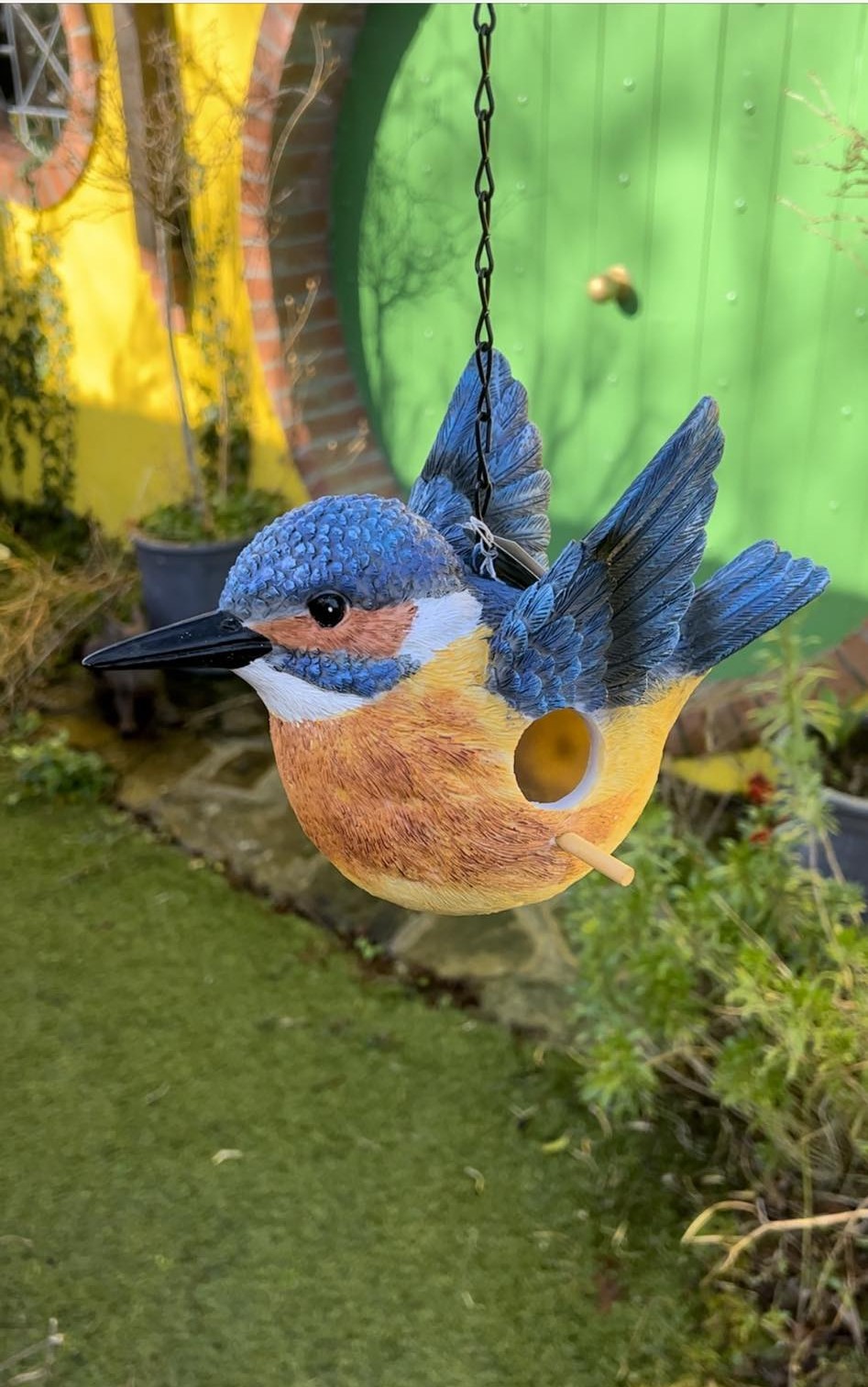 Welcome your feathered friends to your garden with this charming hanging bird house, featuring a beautiful brown and blue design, inspired by the stunning kingfisher bird.