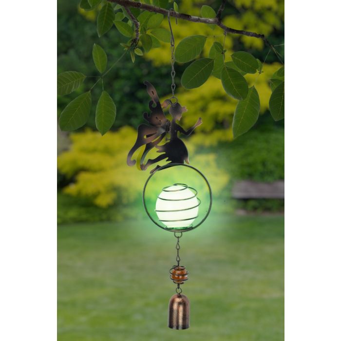 This magical fairy windchime can be attached to hanging brackets, branches, or hooked onto pergolas, archways etc. The little cowbell chime will softly ring out in the breeze, meaning this pretty  decoration can be seen and heard, both day and night. After dark the glow in the dark orb will shine brightly, bringing magic to the night garden