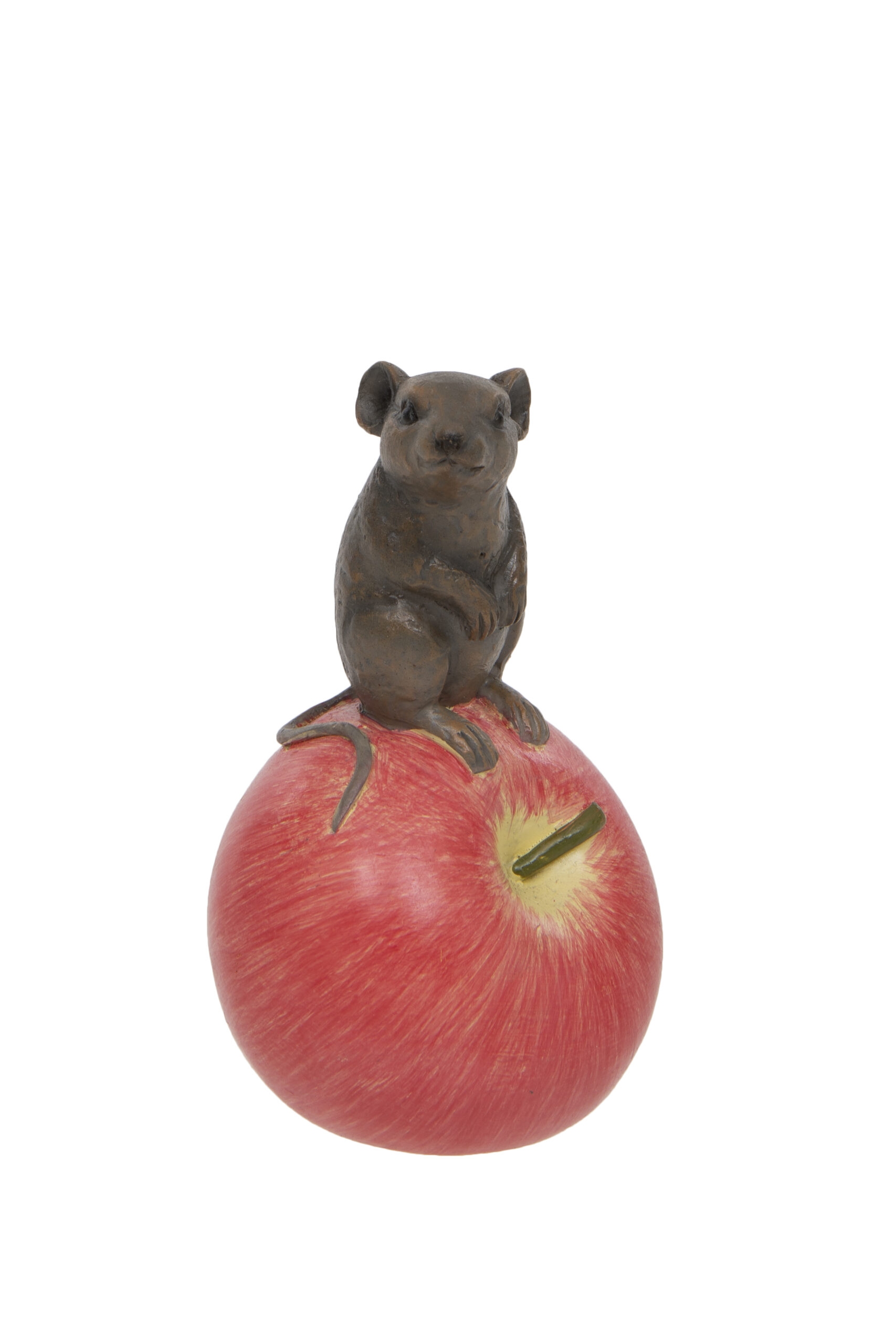 Super cute little mouse sitting on a red apple. Beautifully detailed. 7cm x 6cm x 11cm