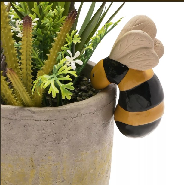 The stoneware garden decoration depicts a cute bee with a gloss finish black and yellow body. It is finished with detailing to its friendly face and makes a welcome addition to plant pots, both indoors and outdoors. 11.5cm x 7.5cm