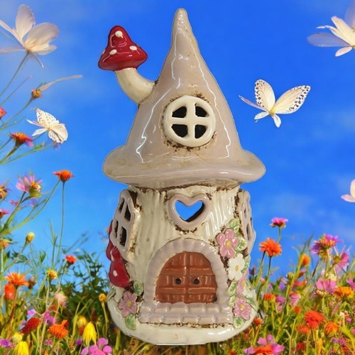 Whimsical pottery fairy house with opening in back for tealight candle. 19cm tall